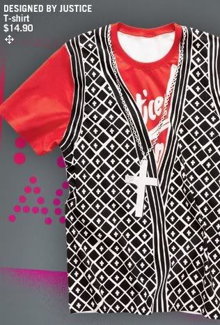 I’m confused. By the picture I can’t tell if the Cross Bling is part of the graphic or some accessory -- same with the dizzying checkered cross-adorned vest. Hey, did you know Justice put out an album called “Cross”. Hooray for borrowed iconography... so PoMo.