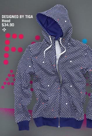 Electro dude Tiga’s got THREE different hoodies -- Grey, Blue and Pink. Vertigo-inducing hoodies are all the rage for some reason but they’re all pretty fugly to me. These, on the other hand, are pretty rad.